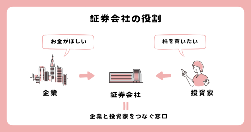たとえば、株を買うケースを考えてみましょう。世の中には株を売って資金を集めたい会社と、株を買って配当金をもらいたい投資家がいます。この会社と投資家をつなぐ役割を担っているのが証券会社です。