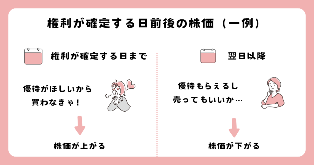 そのため、人気の高い優待がある企業の株は「優待の権利が確定する日までに買おう」と思う人が増え、確定する日までにじわじわと株価が上がることがあります。